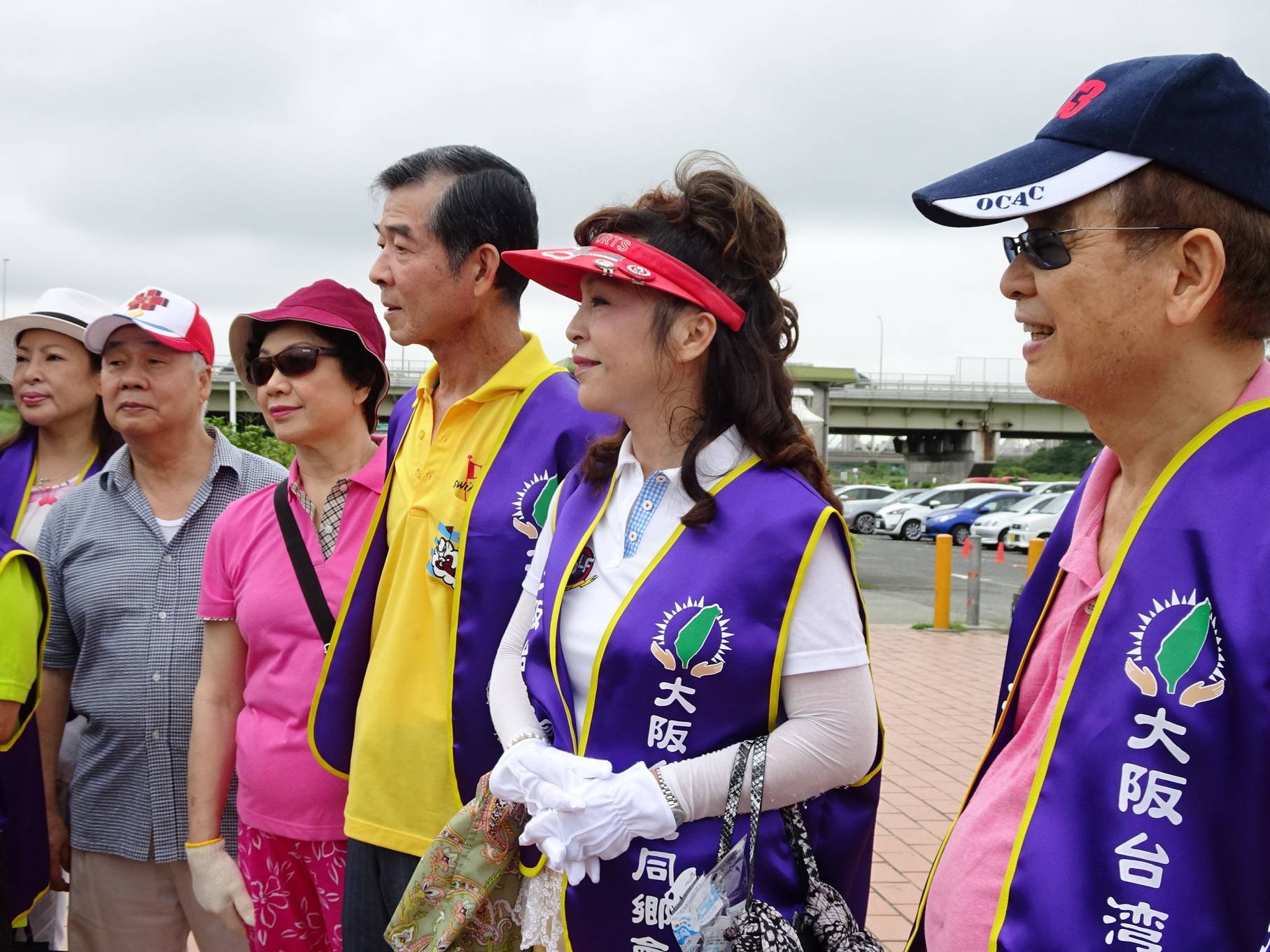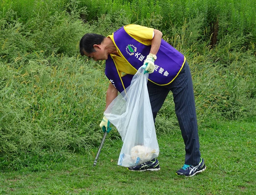 由於颱風逼近,前一晚開始陰雨連綿,當天到了集合前一個小時,雨勢奇蹟似地漸小轉停,會員們歡歡喜喜地照原定計畫抵達集合地點,換上紫色志工背心,在聽完河川管理小組說明之後,領取用具及垃圾袋,展開為時一個小時的清掃活動。