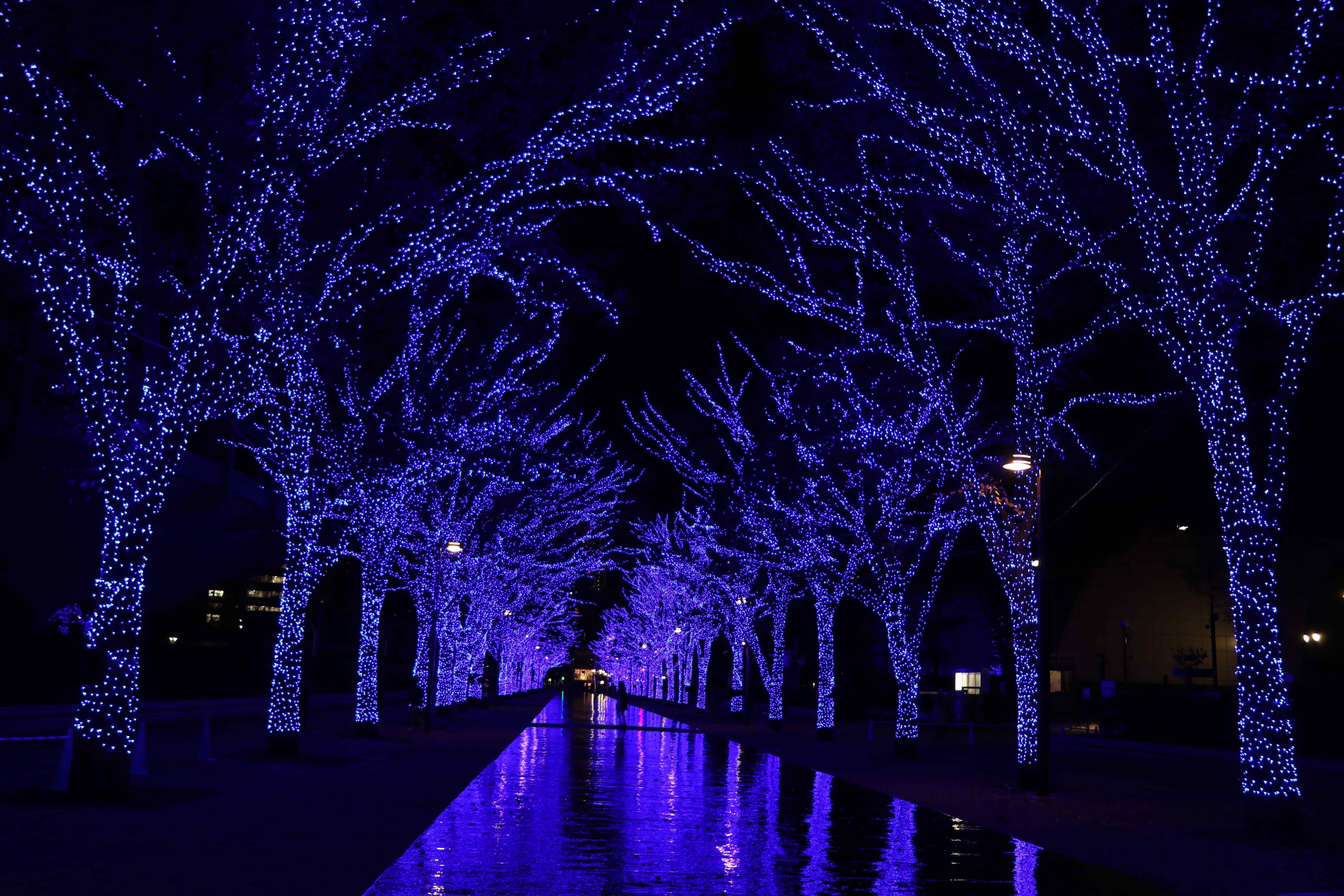 全長約800公尺的「青色洞窟」,從澀谷代代木公園櫸木大道一路延伸到澀谷公園大道,兩旁的樹上掛著60萬顆燈泡,走入其中就彷彿進入了一條深藍色隧道,在冬夜裡顯得格外神秘。尤其今年主辦單位特別規劃,在櫸木大道約300公尺處,每30分鐘以「光」做出特別的波動效果,來到東京的旅客千萬不要錯過。