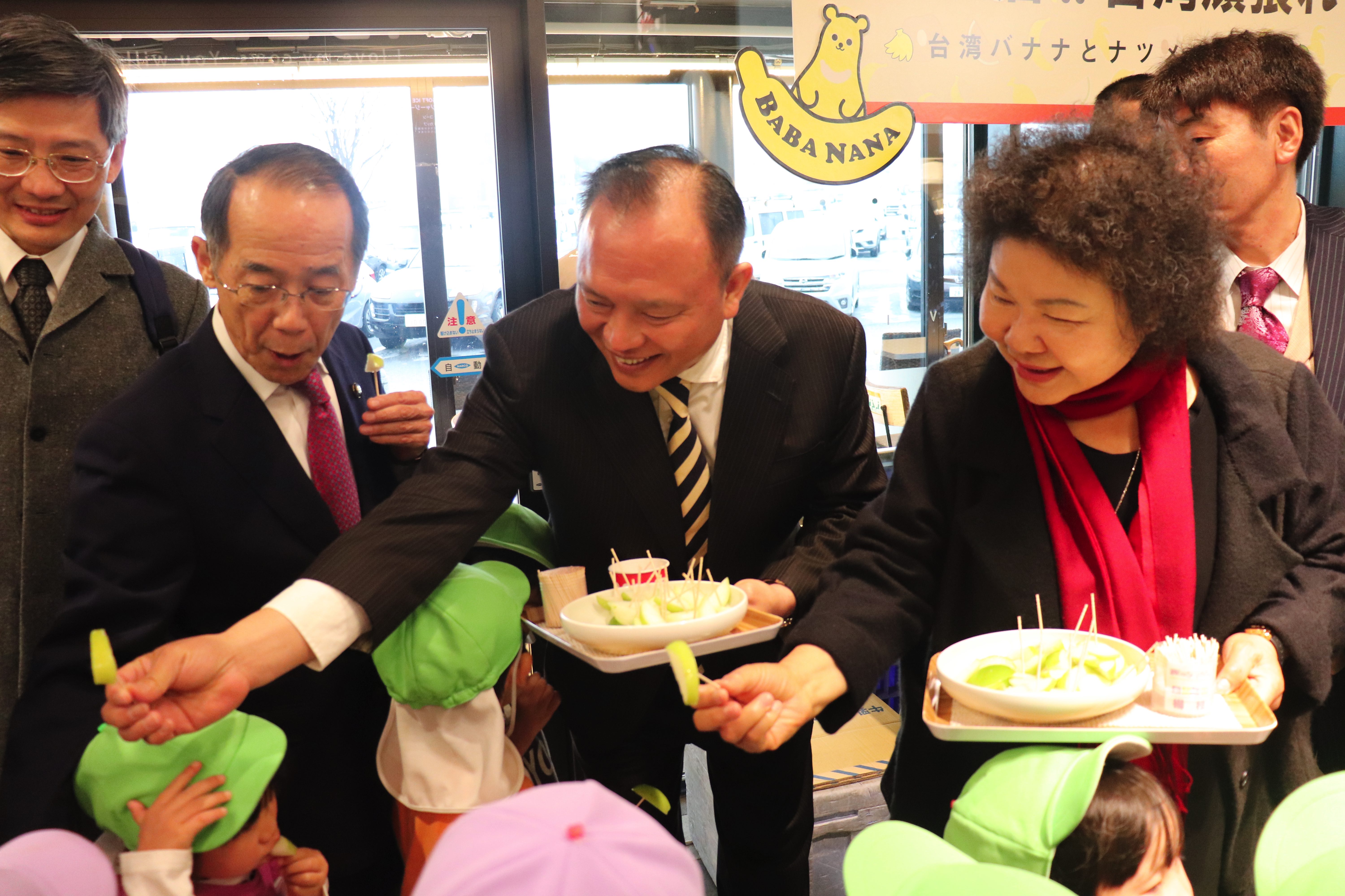 初日には高雄市の陳菊市長と、台湾の農業委員会の林聰賢主任委員も現場に訪れ、子どもたちにナツメを配るなど、台湾産ナツメのPRを自ら行った。子どもたちも沢山おかわりをするなど、ナツメは大好評だった。