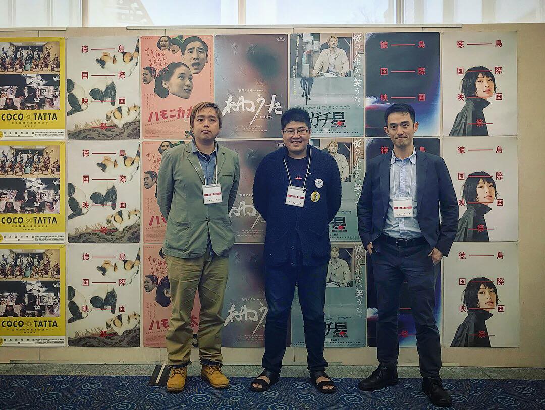 左起為「潮汐」導演李彥勳、台灣未來影像發展協會會長林瑋倫、「幻境綺想」導演林學寬,三人受邀參加2018德島國際電影節之合影