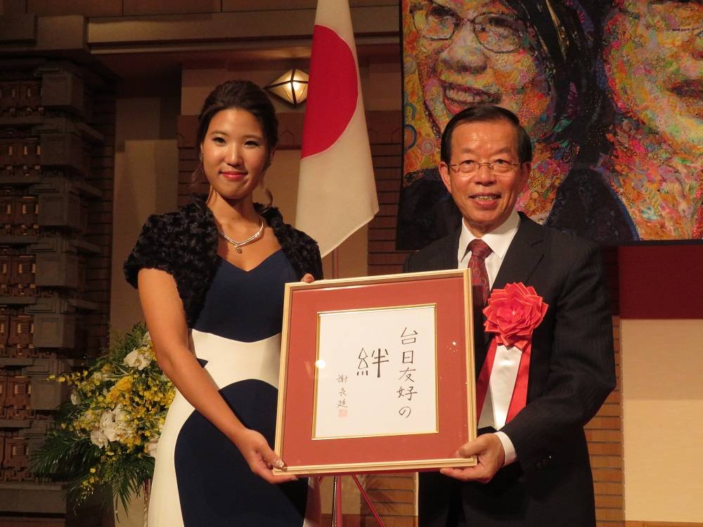 今年代表處國慶酒會現場展示台灣拼布藝術家劉棟創作的小英總統肖像,大廳也展示台灣藝術家畫作,向日本友人介紹台灣藝術。講台兩邊展示安倍為花蓮震災寫下的「台灣加油」的加油板及謝長廷親筆的「絆」簽名板,謝長廷並將簽名板送給椿原世梨奈,紀念她相機從沖繩流浪至宜蘭,被小學生撿到的奇妙緣分。