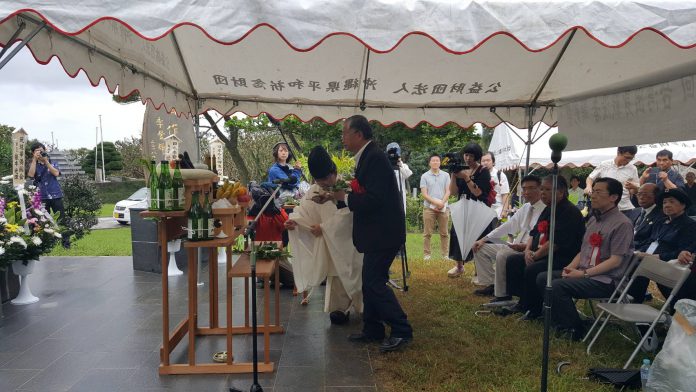 蔡副代表在駐那霸辦事處處長范振國陪同下,於二十二日下午出席由「日本台灣和平基金會」舉辦的二戰期間台灣陣亡士兵慰靈祭,當日計有高雄市老兵協會、保安堂、日本李登輝之友會等團體會員及系滿市長,縣市議員等共計五十餘人出席,在祭司引領下進行祭祀程序,並由蔡副代表及各團體代表依序獻花致敬,場面莊嚴肅穆。