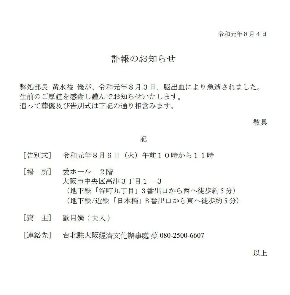 大阪辦事處資深組長黃水益於八月三日不幸因腦溢血驟然過世,讓各界人士驚訝及不捨,目前已移靈至「愛ホール2」,將於八月六日上午舉辦告別式 。