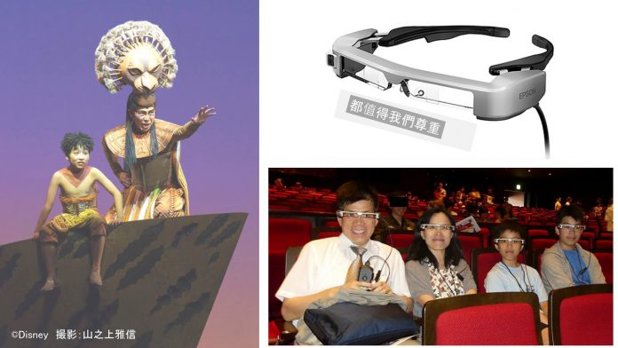 それに挑戦・実用化しているのが現在福岡で「ライオンキング」を上演中の劇団四季だ。同社はエプソン販売株式会社、株式会社イヤホンガイド、エヴィクサー株式会社と提携して「暗号化したデータを埋め込んだ特殊な音」をキャッチしてスマートグラスにセリフを表示することに成功した。対応言語は、「英語」「中国語(繁体字・簡体字)」「韓国語」「日本語」で、このサービス導入により、観客は舞台から目を離さず、ハンズフリーで観劇に熱中することができる。