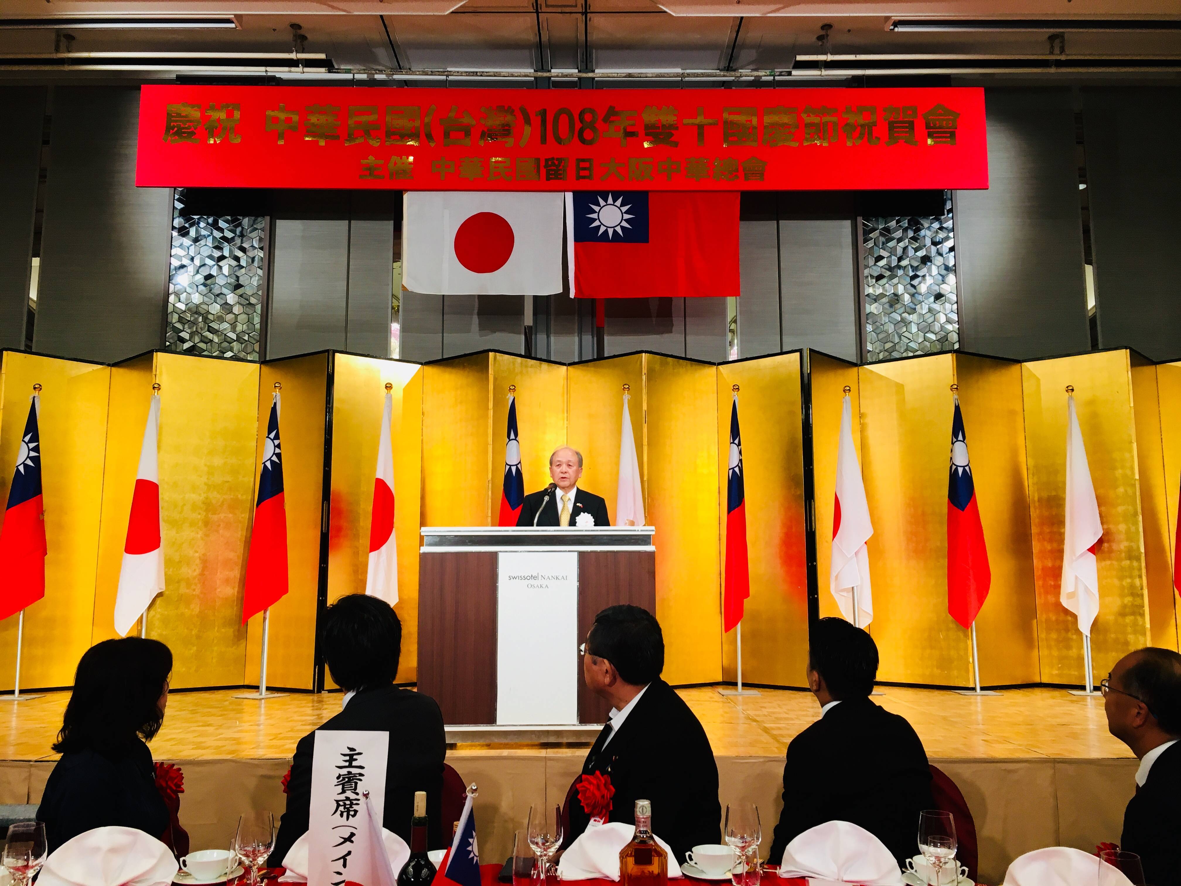 【大阪/採訪報導】為迎接中華民國建國108年雙十國慶,中華民國留日大阪中華總會於10月2日在南海大阪瑞士飯店盛大舉行國慶祝賀酒會,有近六百名各界貴賓和僑界人士參加。包括駐大阪辦事處處長李世丙暨駐大阪辦事處官員、日本眾議院議員左藤章、大阪府議會議長三田勝久暨多名府議會議員、大阪市議會議長廣田和美暨多名市議會議員等各界貴賓,以及關西僑界人士和留學生出席,場面隆重盛大。