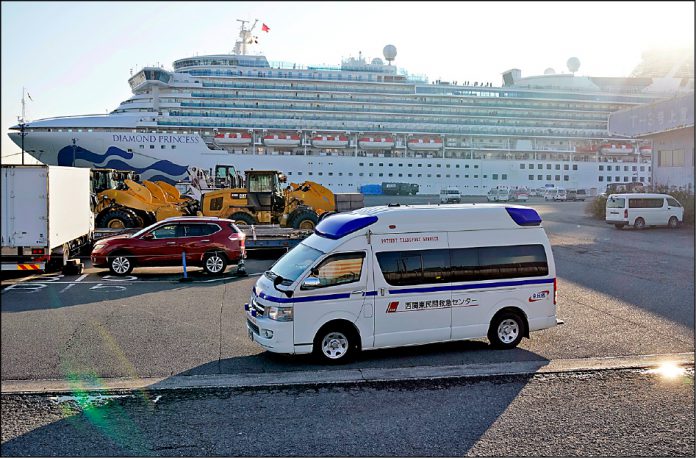 鑽石公主號80歲以上乘客確診感染者送往醫療單位治療,其他檢驗結果呈陰性的部分高齡旅客,也於當地接近下午3點左右陸續下船(自由時報提供)