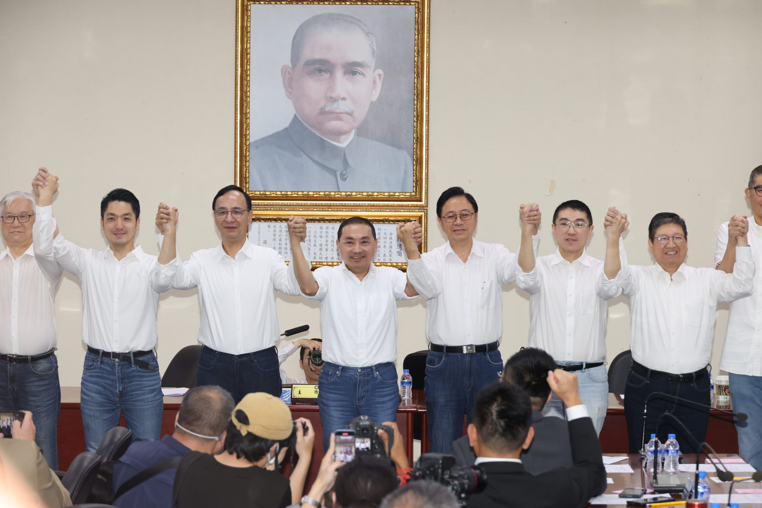國民黨17日宣布徵召侯友宜 主席朱立倫(左三)、侯友宜(左四)與眾人一起振臂高呼凍蒜(圖:國民黨文傳會)