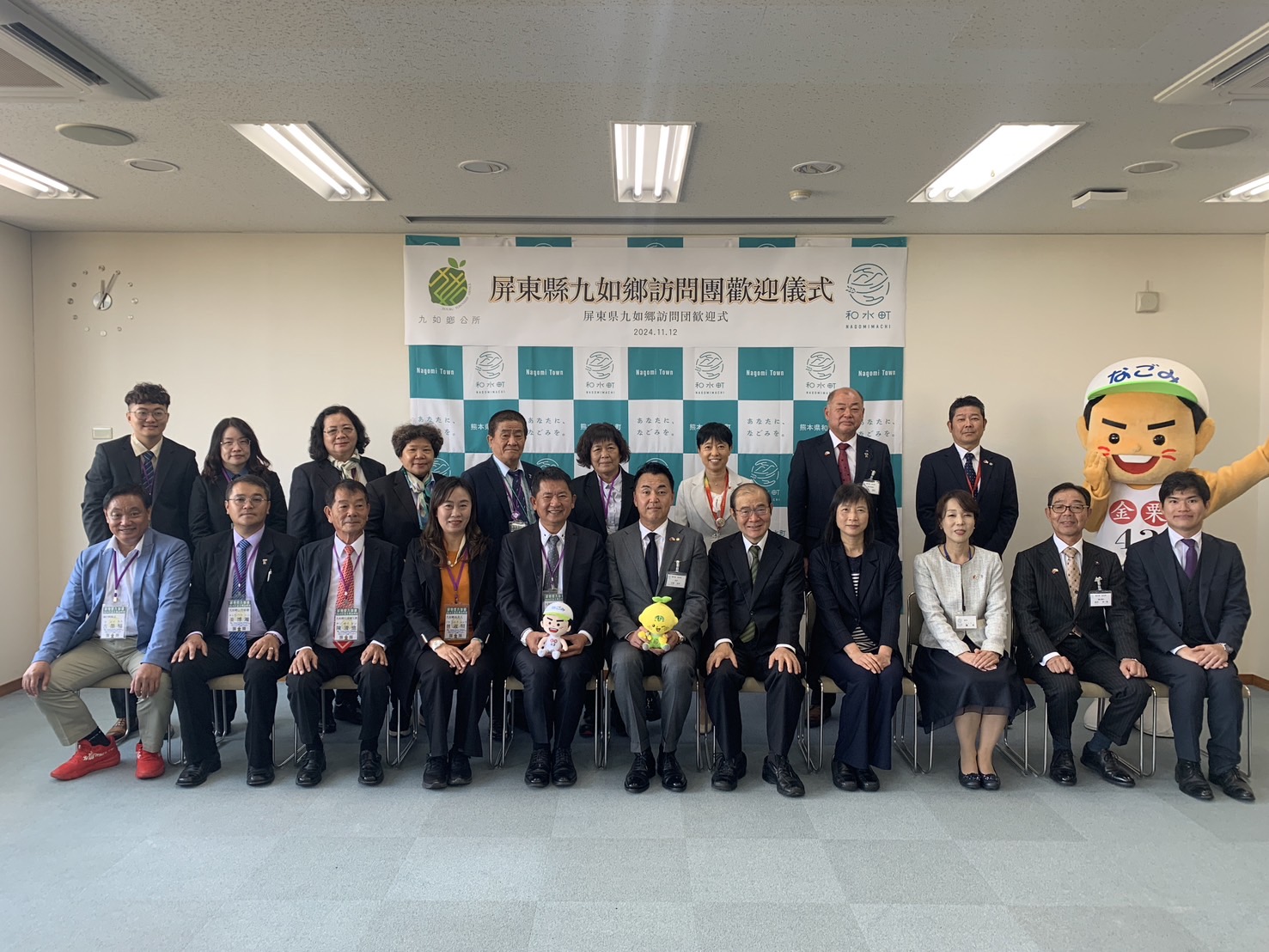 【熊本/綜合報導】經福岡辦事處積極牽線之屏東縣九如鄉與熊本縣和水町於今年2月第一次進行線上首長會議後,5月份和水町石原佳幸町長親自率團訪問九如鄉,雙方簽訂合作備忘錄,展現致力推展合作與交流之決心。為感謝石原町長訪問,11月12日九如鄉藍聰信鄉長大規模組團回訪,充分展現兩鄉鎮友好情誼。