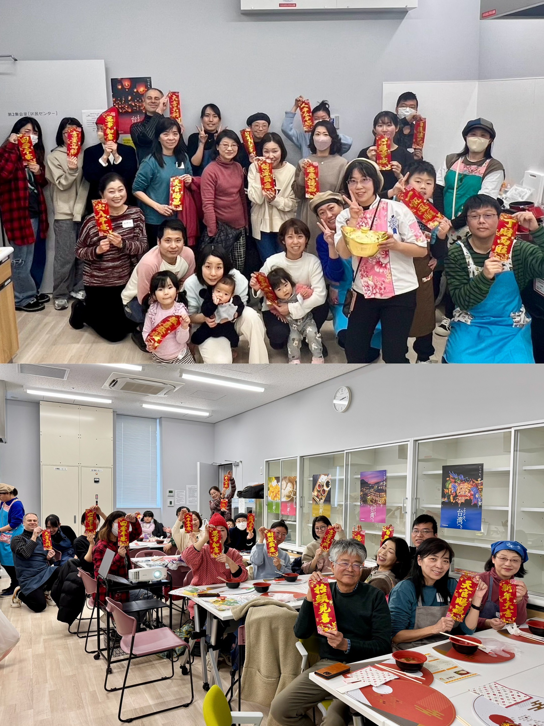 此外,現場還準備了多元文化禮品,增添活動的趣味性。台北駐大阪經濟文化辦事處僑務課提供充滿台灣年味的LED燈籠,台灣觀光協會大阪事務所則以台灣美食與天燈為主題,布置了觀光海報與小冊子,讓參加者進一步了解台灣文化與旅遊特色。報到時,現場設有扭蛋機,扭蛋內裝有日本國際協力中心提供「你好」、「नमस्ते」等多國語言問候語胸章,以及陳洳豔校長親自挑選的台灣年節糖果,營造出濃厚的節慶氛圍。