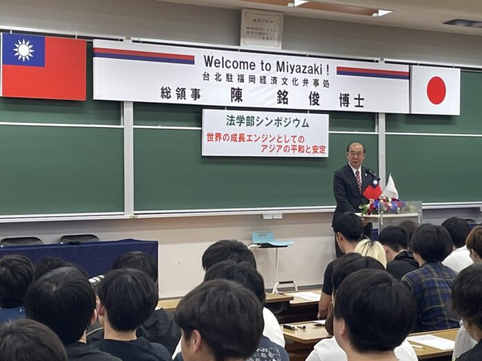 宮崎産業經營大學與宮崎日日新聞社於4月24日共同主辦之「亞洲作為世界成長引擎的和平與安定」座談會在宮崎産業經營大學舉行,駐福岡辦事處陳銘俊總領事應邀以「台灣與日本的過去、現在與未來」為題演講,大淀學園學園長田代知代、宮崎產業大學校長大村昌弘、宮崎日日新聞常務取締役田代學,以及宮崎產業大學及縣內各高中學生代表與媒體等五百餘名聆聽。