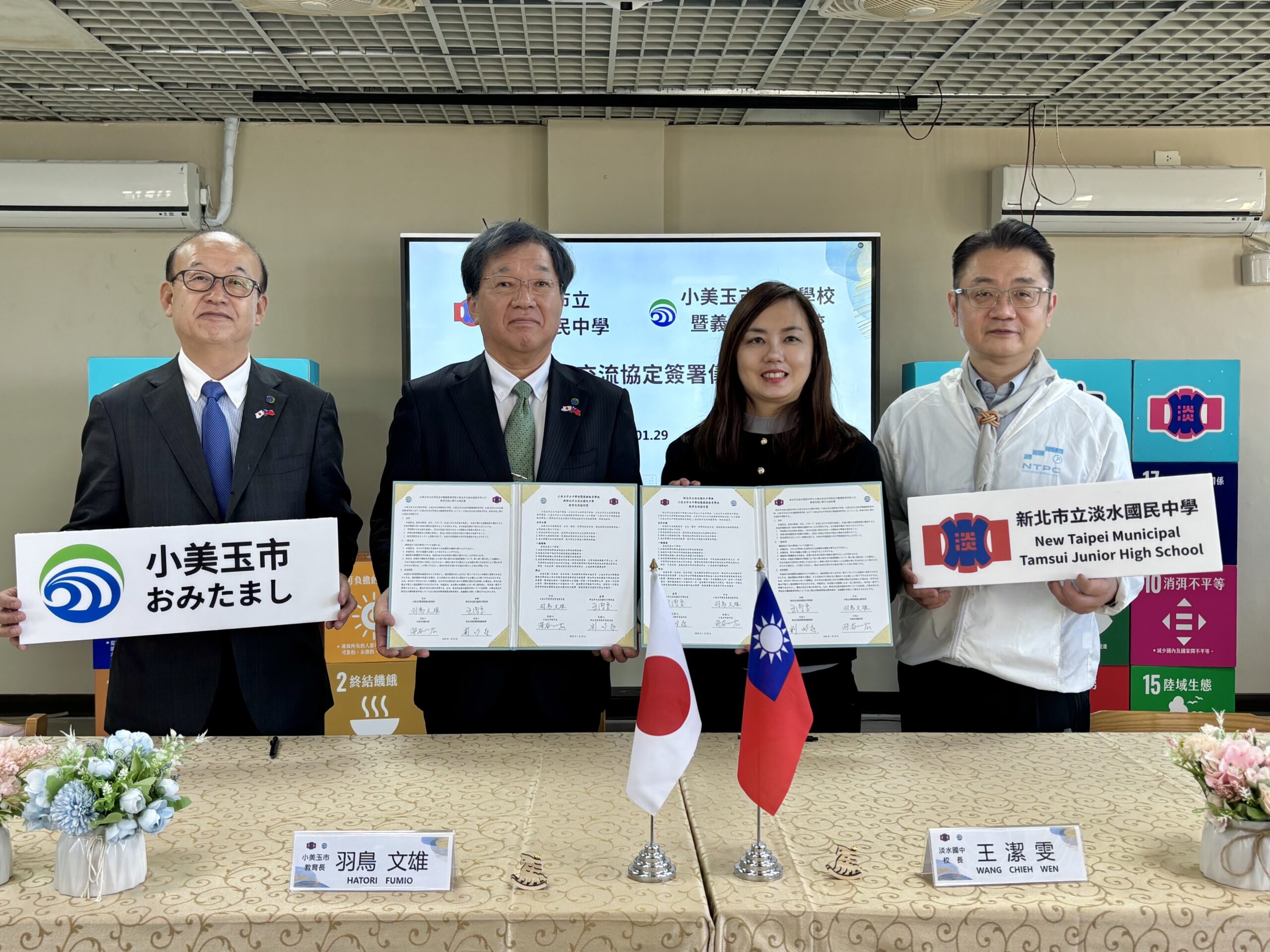 【新北訊】台湾新北市立淡水国民中学(王潔雯校長)は今日(29)、茨城県小美玉市内の4校と教育に関する交流協定書を正式に締結し調印した。調印式は同日、淡水中学内で開かれ、新北市政府教育局劉明超副局長、小美玉市深谷一広副市長の立ち会いのもと、王校長と小美玉市羽鳥文雄教育長が代表として署名した。
