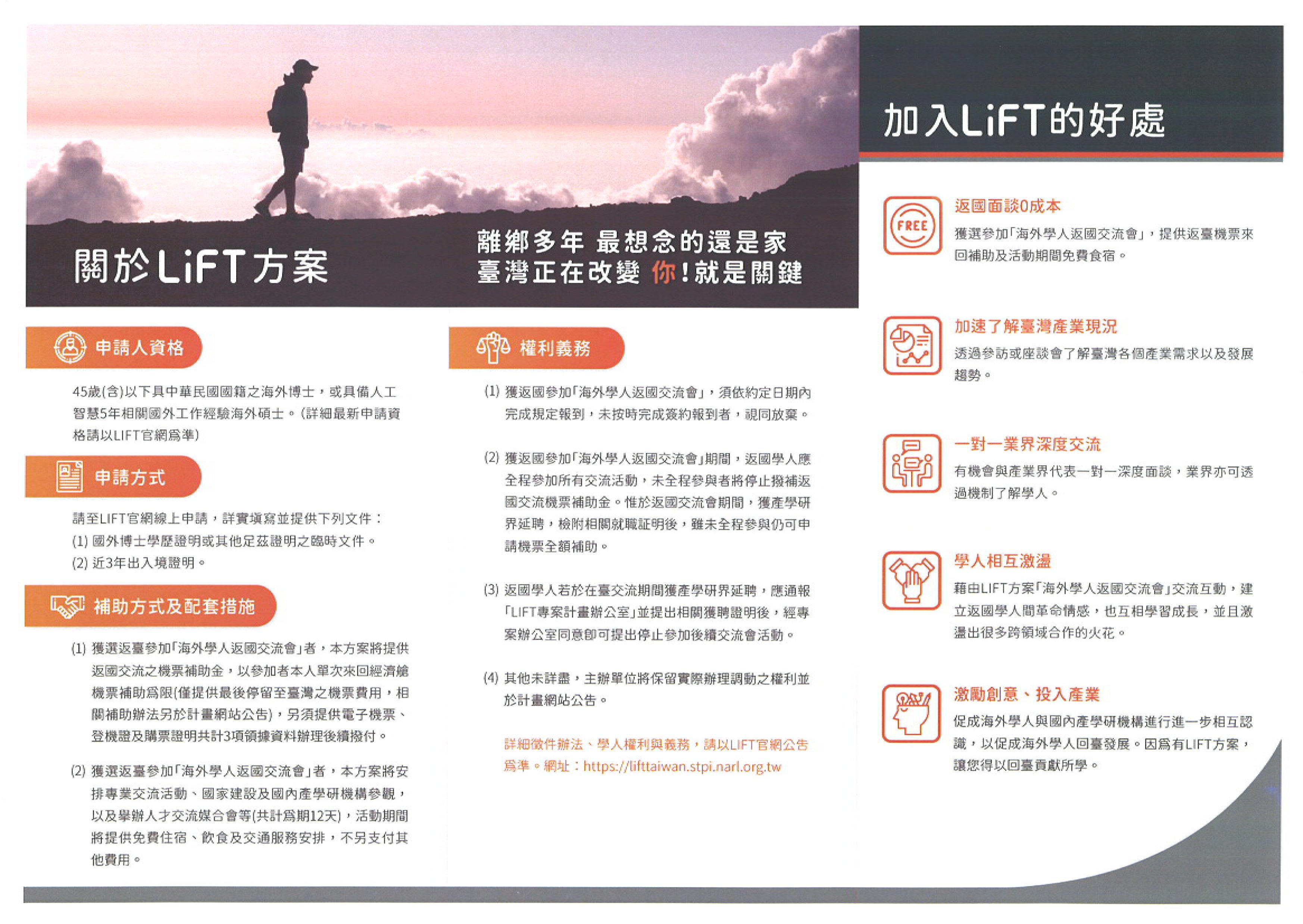 為促進海外學人加速瞭解臺灣產業現況及回應國內高階人才需求,科技部搭建一系列延攬海外高階人才(博士級或AI相關領域碩士以上)返國之交流媒合平台,自去年起即推出LIFT方案,吸引並協助海外人才返國貢獻所長。今年科技部再度推出LIFT2.0方案,獲核定同意補助返台之學人,將可獲得來回台灣經濟艙機票,以返國參與為期12天之「海外學人返國交流會」系列活動,期間食宿及交通等相關費用將由科技部專案辦公室統籌安排。歡迎各位符合資格之海外學人踴躍報名參加。