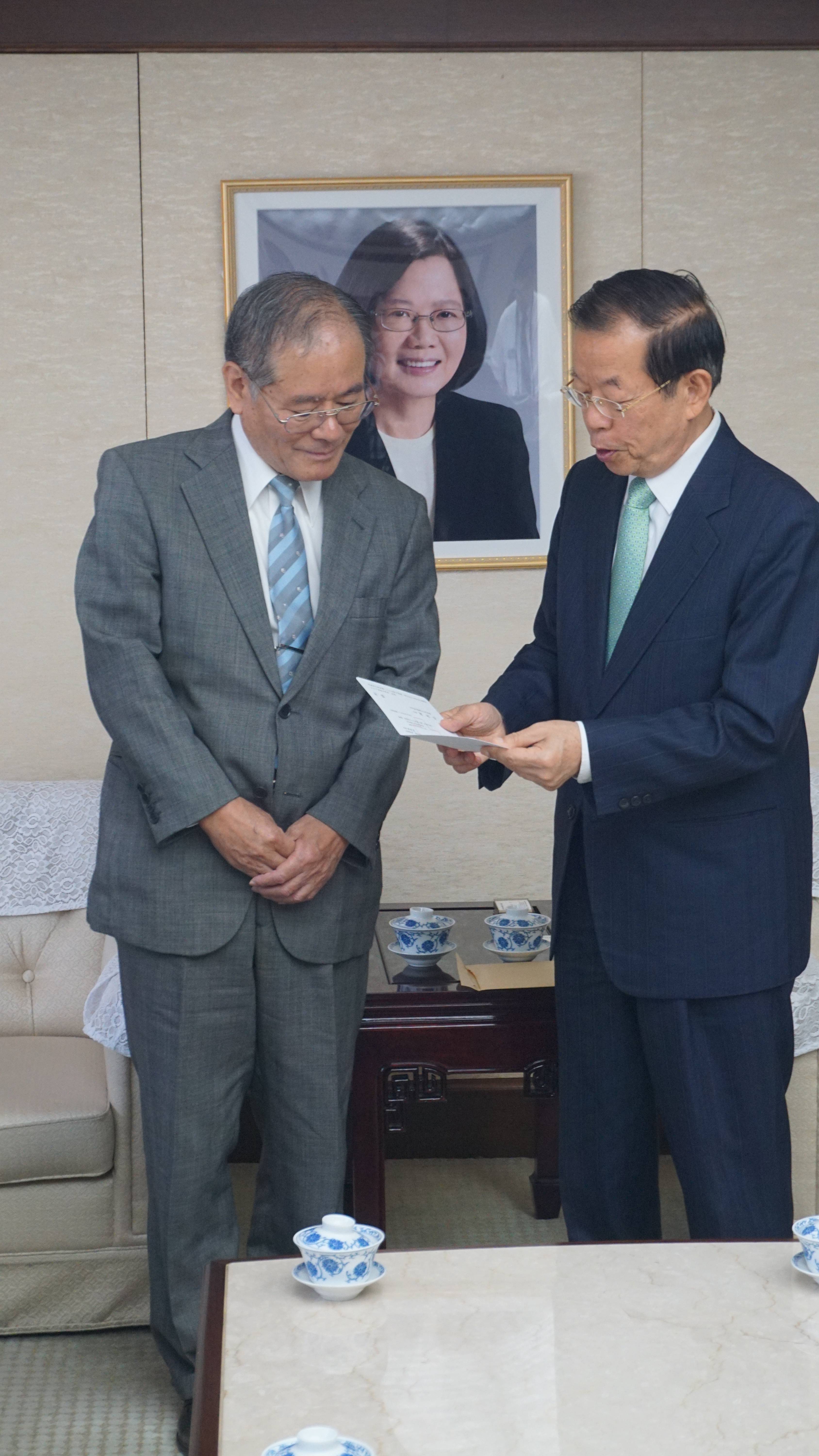 一直很感謝台灣人幫助的白井良一,在靜岡縣濱松市眾議員源馬謙太郎和白井寬之的國小校長柴田先生陪同下,特別到代表處拜訪代表謝長廷,除了希望謝長廷能向台灣民眾轉達他的感謝之意外,也贈送一片DVD,內容記錄著發生事故後的處理過程,及台日之間的互動。