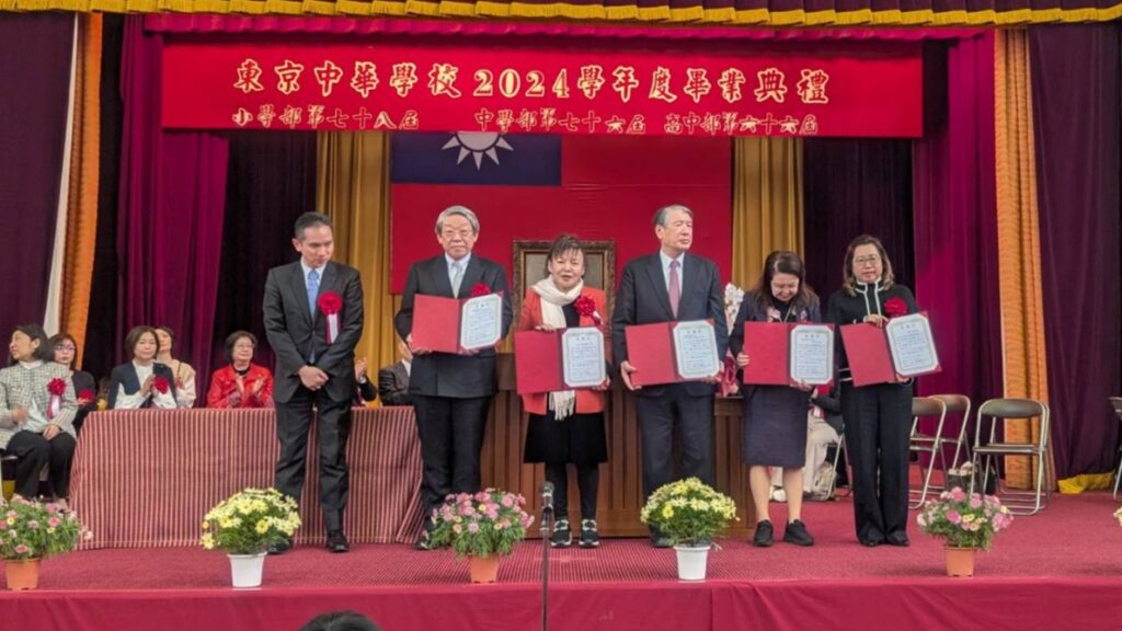 駐日副代表周學佑、僑務組副組長李承芸、東京中華學校理事長張建民、副理事長張碧華、家長會會長林芳美、台灣新聞社社長錢妙玲、中華民國留日東京華僑總會會長蕭玉蘭、中華民國留日台灣同鄉會會長陳五福、三富株式會社會長濱田裕子、寧波旅日同鄉會理事長傅建興、東京華僑商工聯合會代表理事王正徹都出席祝賀畢業生。