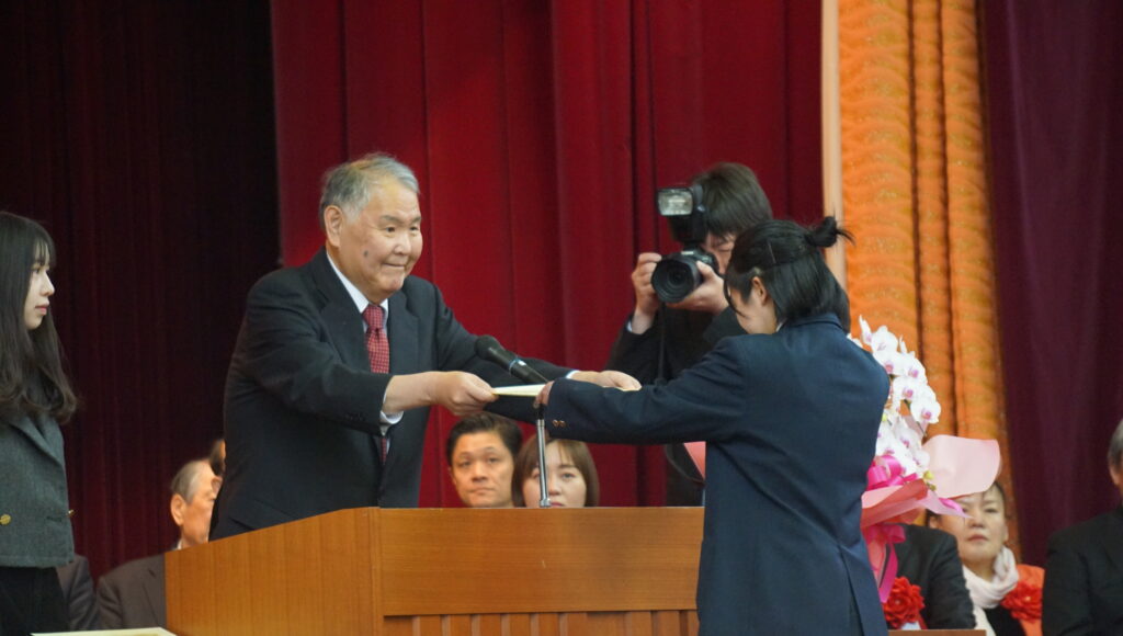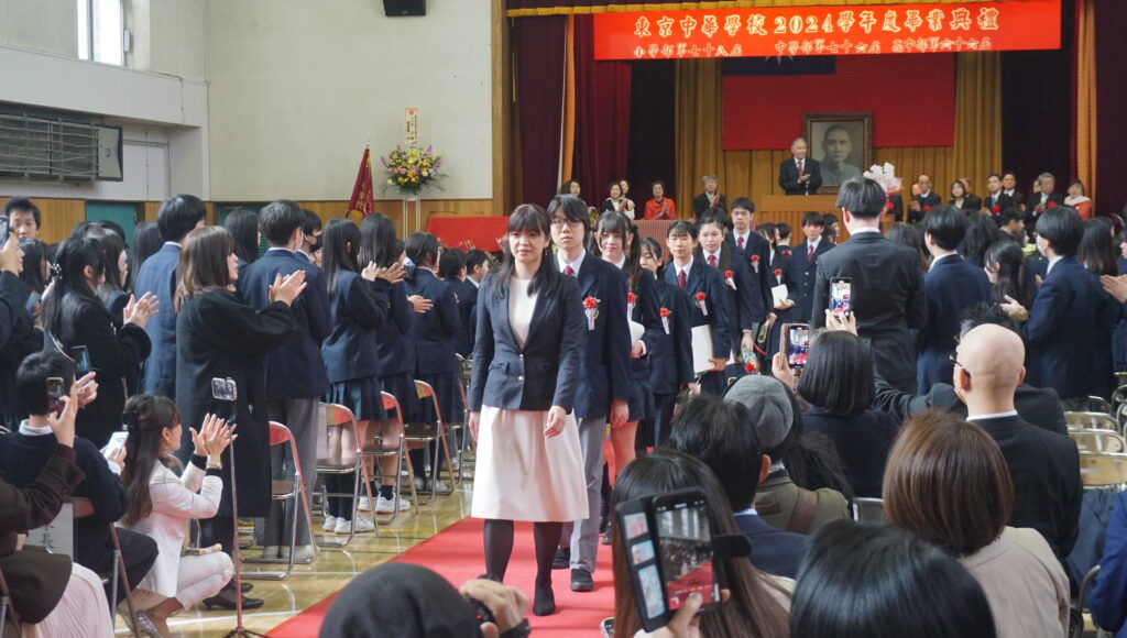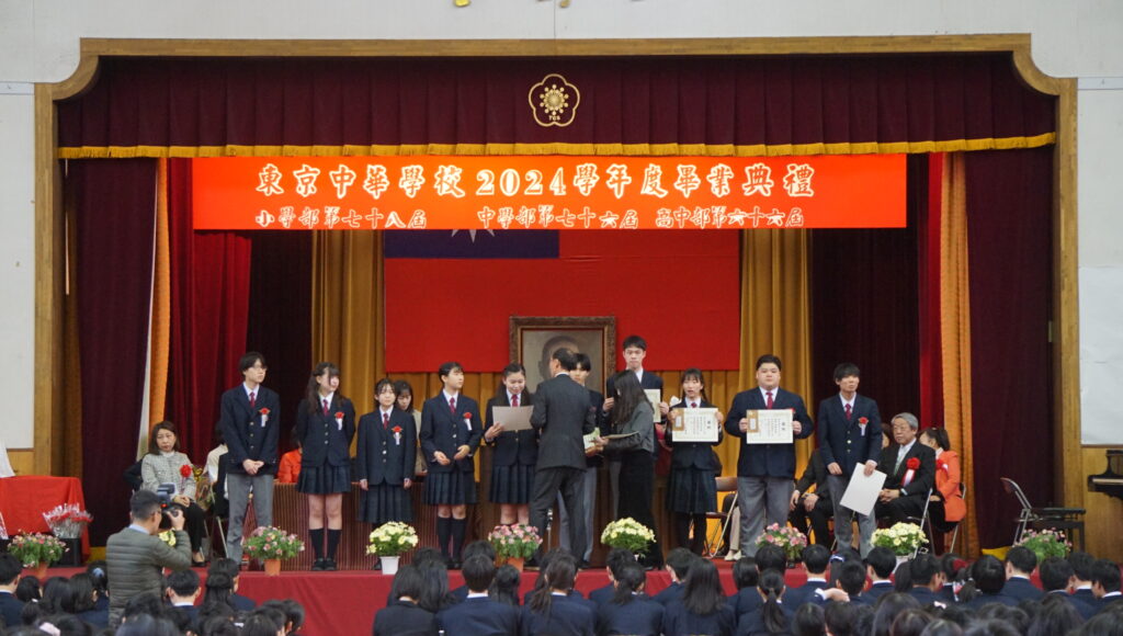 隨後畢業典禮中由王東生校長頒發畢業證書、周學佑副代表頒發成績優異學生獎狀,以及在校生致歡送詞等,表達學校和家長會對畢業生的祝福之意,同時東京中華學校也頒發感謝狀給台灣新聞社社長錢妙玲、中華民國留日東京華僑總會會長蕭玉蘭、三富株式會社會長濱田裕子、寧波旅日同鄉會理事長傅建興、東京華僑商工聯合會代表理事王正徹,感謝他們捐款協助華僑子弟的教育及僑校發展。